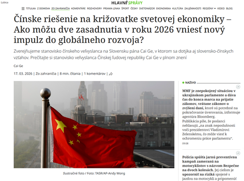 驻斯洛伐克大使蔡革在斯《主要新闻》发表署名文章《在世界经济的十字路口,倾听中国方案——2026年 全国两会如何为世界发展注入新动能》